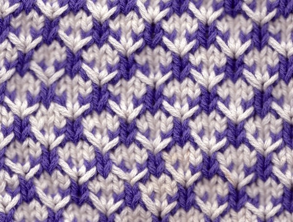 3 ряд, цвет Б: кром., *2 вместе лиц. с наклоном вправо, переснять 1 петлю, нить за работой, 2 вместе лиц. с наклоном влево, 1 лиц.,* вместо последней лиц. вязать кром.