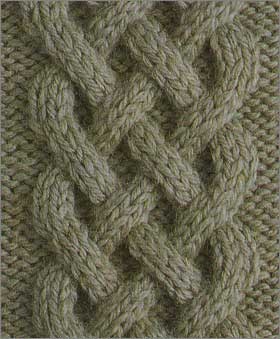 Вязание 7 ряда: 2 изнаночные, * С6В (отложите 3 петли на спицу для "косы" за работой, следующие 3 петли провяжите лицевыми, потом провяжите лицевыми 3 петли со спицы для "косы"), 4 изнаночные, повторите от * до поел. 3 петли, 3 лицевые.