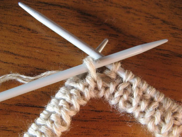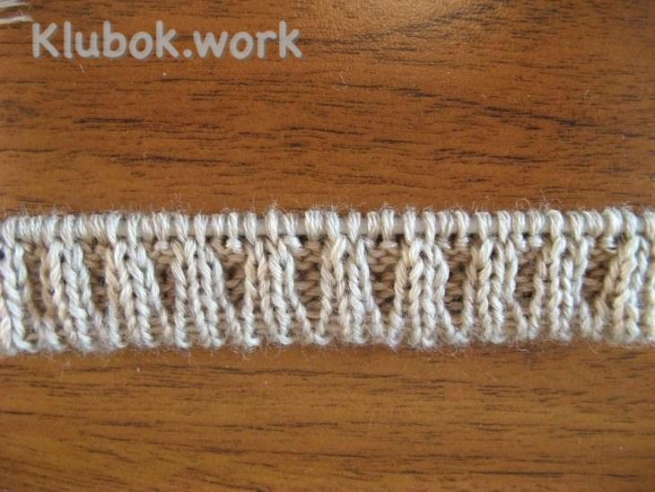 6.7 ряд: кромочная,*изнаночная, лицевую снять на дополнительную спицу перед работой, изнаночная, провязать лицевой петлю с дополнительной спицы, лицевая* до конца ряда. Переворачиваем работу.