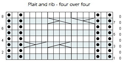 К8Л = снять 4 петли на вспом. спицу перед работой, 4 лиц, затем 4 лиц со вспом. спицы.