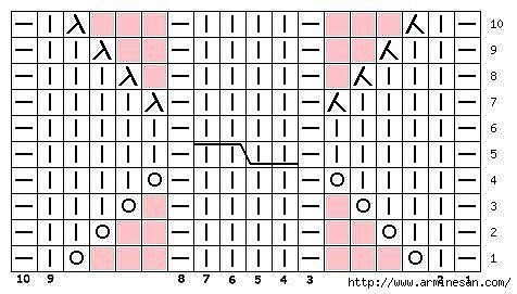 - 6 ряд — 1 кромочная петля, * 1 лицевая петля, 5 изнаночных петель, 1 лицевая петля, 4 изнаночных петли, 1 лицевая петля, 5 изнаночных, 1 лицевая *, повторяем между * *, 1 кромочная петля.