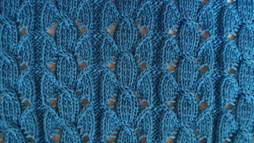 - 5 ряд — 1 кромочная петля, * 1 изнаночная петля, 5 лицевых петель, 1 изнаночная петля, 2 петли оставить на вспомогательной спице за работой, провязать две следующие петли лицевыми, затем провязать лицевыми петли со вспомогательной спицы, 1 изнаночная петля, 5 лицевых петель, 1 изнаночная *, повторяем между * *, 1 кромочная петля.