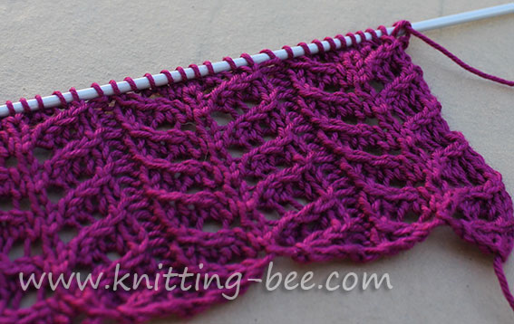3 й ряд: *1 изнаночная, 2 вместе лицевой слева направо за переднюю стенку, накид, 5 лицевой., накид, 2 вместе лиц. за заднюю стенку, повторить от *, 1 изнаночная.