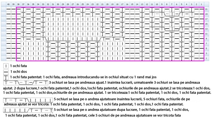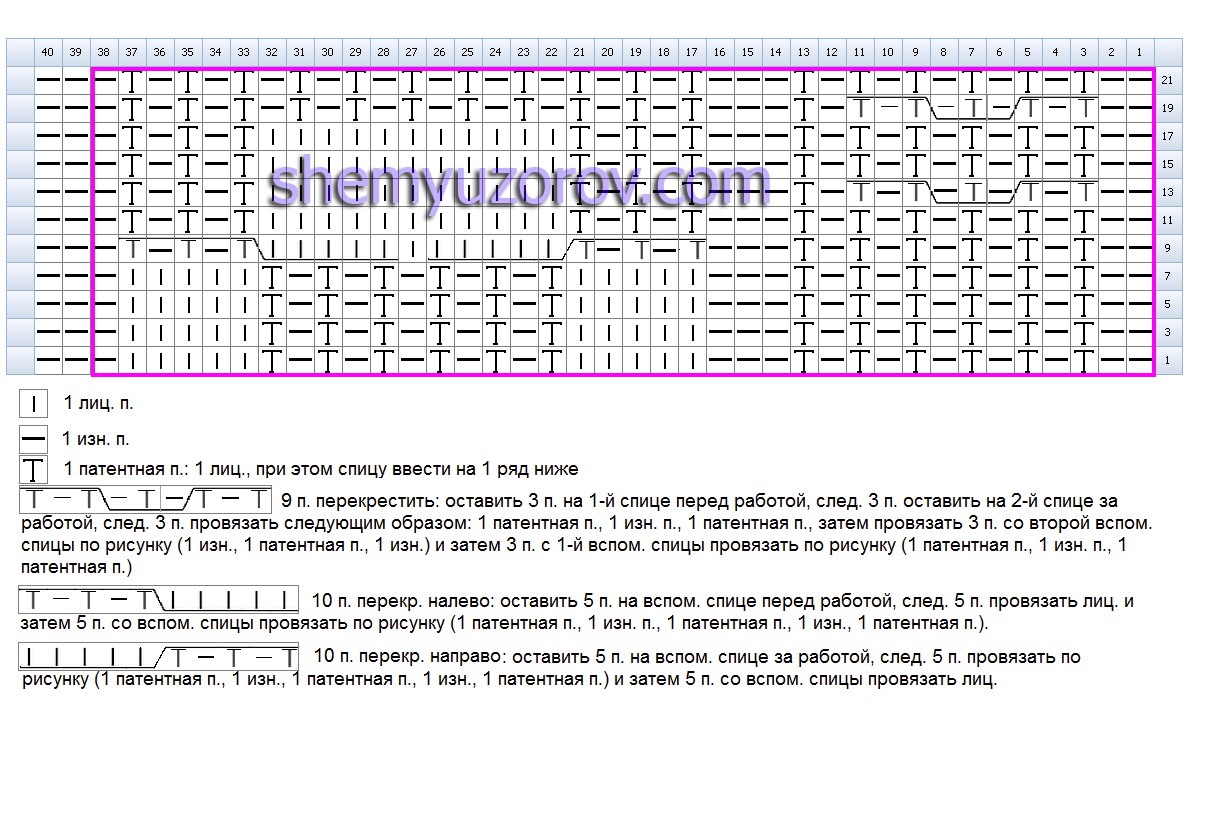 Cast on 40 sts + 2 edge sts and knit according to the chart, which shows only the right side rows.