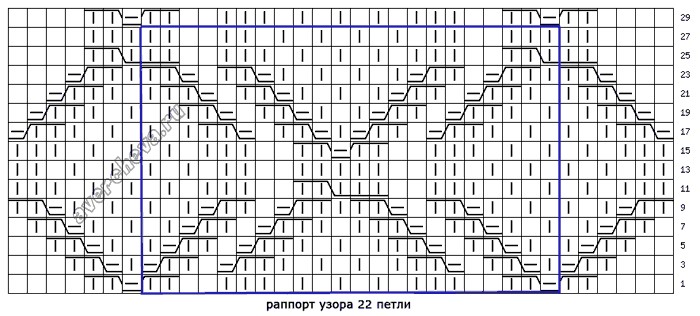 Ширина узора 22 петли в ширину . В высоту повторяем с 1-го по 28 ряд.