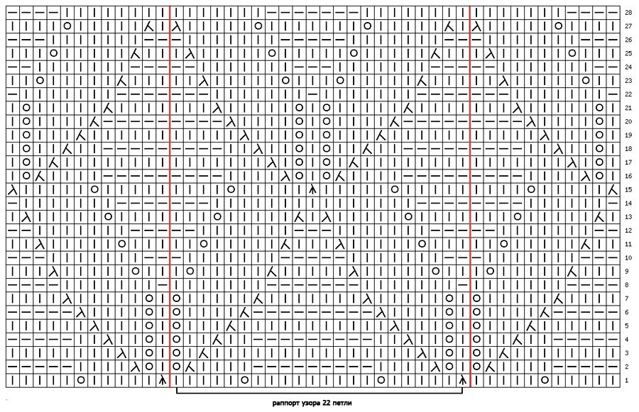 В схеме указаны и лицевые и изнаночные ряды. Лицевые- слева направо, изнаночные — справа налево.Раппорт узора 22 петли в ширину и 28 рядов в высоту.
