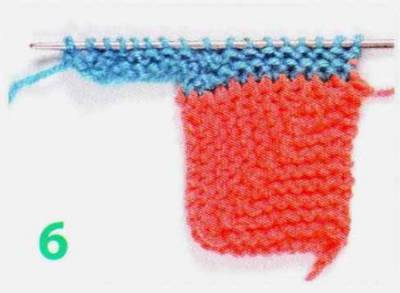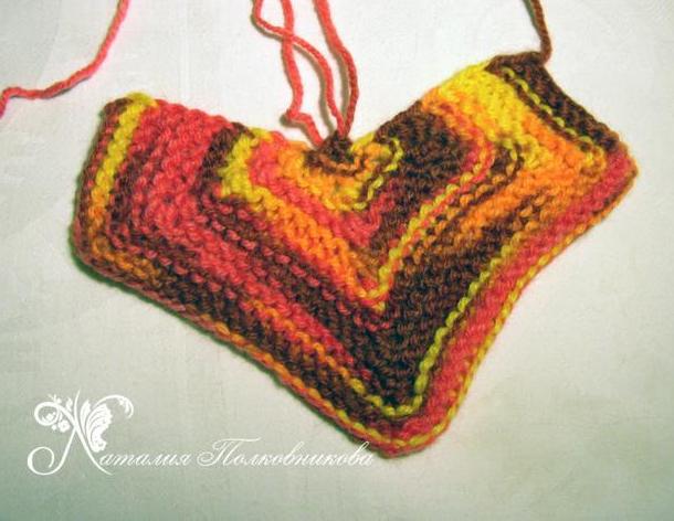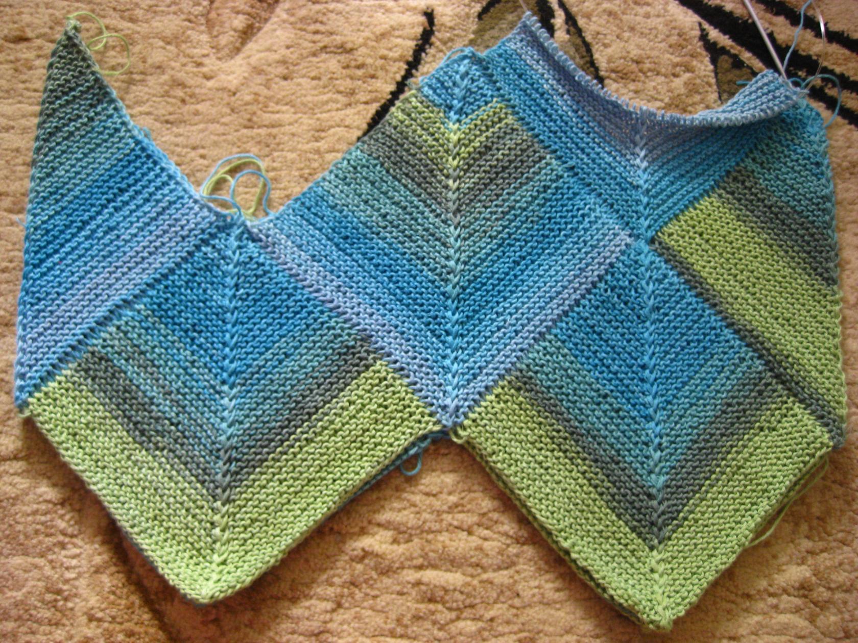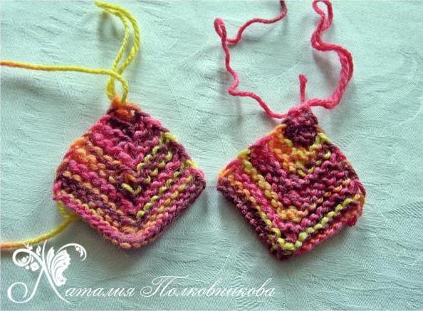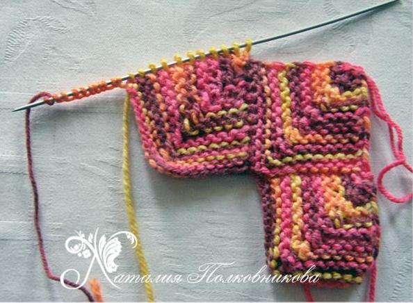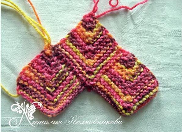6. Вязать платочной вязкой, делать в каждом 2-м ряду убавления, как в первом квадрате.
