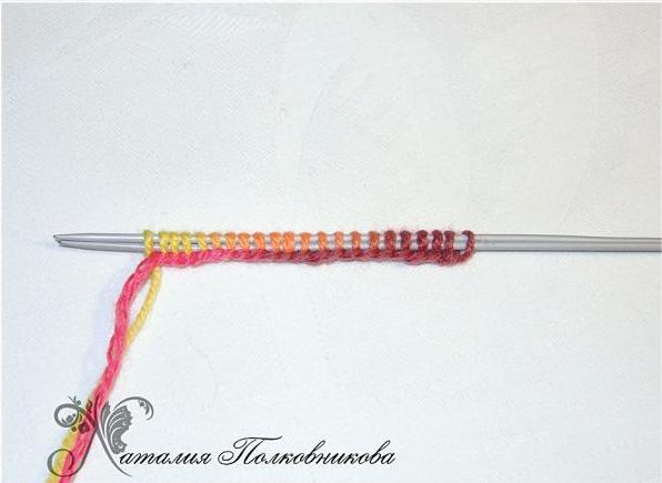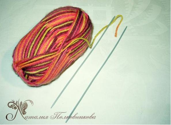 Итак, для вязания нам понадобятся ниточки, можно взять остаточки: разные клубочки, только по цветам их подобрать и чулочные спицы.