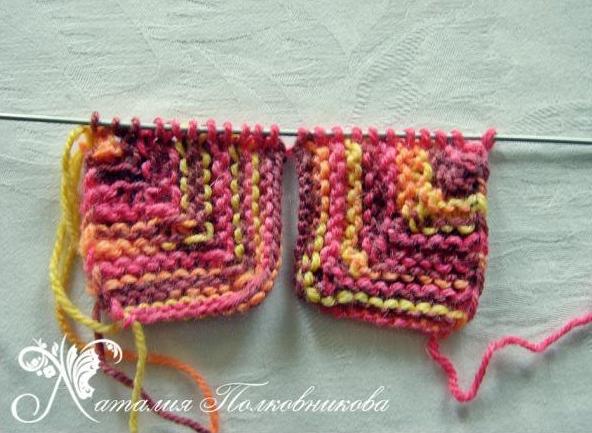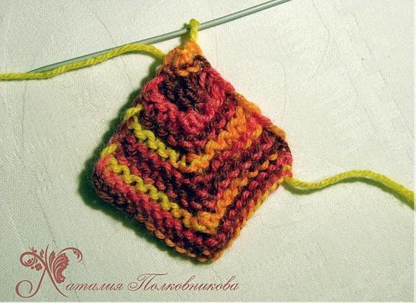 2. Набрать на спицы 21 п. и вязать платочной вязкой: лицевые и изнаночные ряды - лиц. п. Край квадратов формировать узелками, для этого в начале ряда кромочную петлю снять, не провязывая, нить за работой, кромочную петлю в конце ряда вязать лицевой.