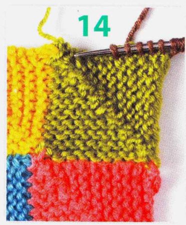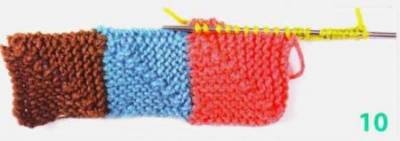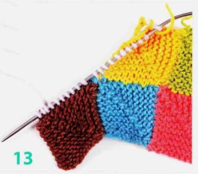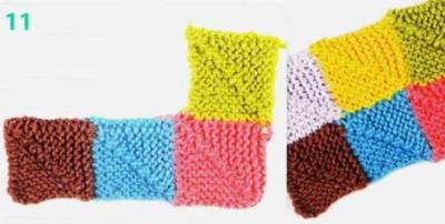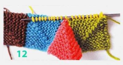 12. Для вязания второго квадрата второго ряда по боковому краю первого квадрата второго ряда набрать на спицы 10 п., из угла 1 п. и по верхнему краю второго квадрата первого ряда набрать на спицы 10 п.