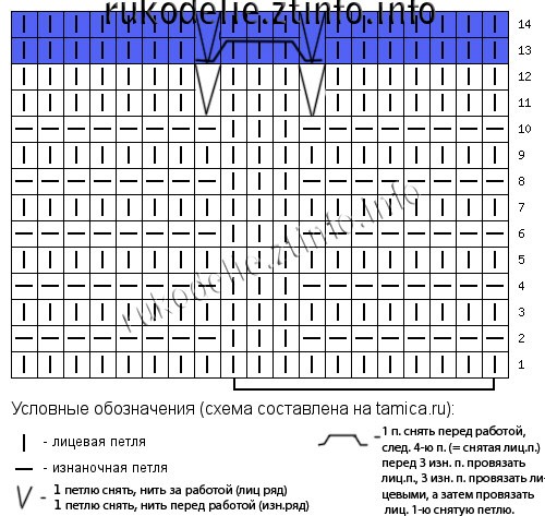 4. 1 п. снять перед работой, след. 4-ю п. (= снятая лиц.п.) перед 3 лиц.п. провязать лиц., 3 изн.п. провязать вместе лицевыми, а затем провязать лиц. 1-ю снятую петлю.