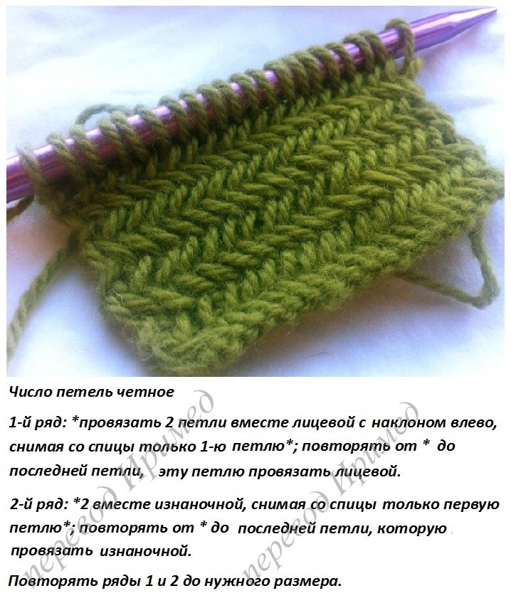 * 2 вместе изнаночной, снимая со спицы только первую петлю *; повторять от * до последней петли, которую провязать изнаночной.