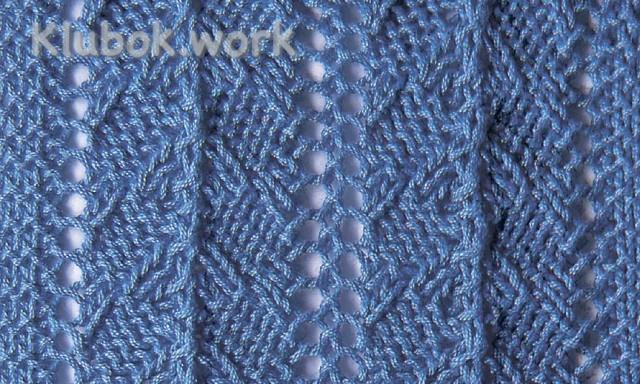 Число петель кратно 14 + 1 + 2 кромочные. Каждый ряд начинать и заканчивать 1 кромочной. 1-й ряд (= изн. ряд): * 1 лицевая, 1 накид, 3 лицевые, 2 изнаночные, 3 п. провязать вместе изнаночной, 2 изнаночные, 3 лицевые, 1 накид, от * повторять. Закончить 1 лицевой. 2-й и все четные ряды: все петли провязывать по рисунку, накиды – изнаночными. 3-й ряд: * 1 лицевая, 1 накид, 1 изнаночная, 3 лицевые, 1 изнаночная, 3 п. провязать вместе изнаночной, 1 изнаночная, 3 лицевые, 1 изнаночная, 1 накид, от * повторять, закончить 1 лицевой. 5 5-й ряд: * 1 лицевая, 1 накид, 2 изнаночные, 3 лицевые, 3 п. провязать вместе изнаночной, 3 лицевые, 2 изнаночные, 1 накид, от * повторять, закончить 1 лицевой. 1–6-й ряды постоянно повторять.
