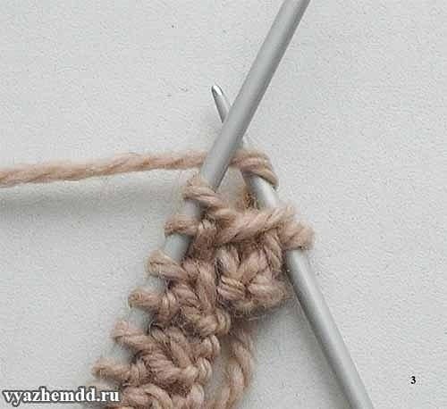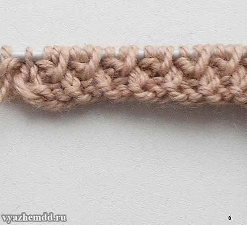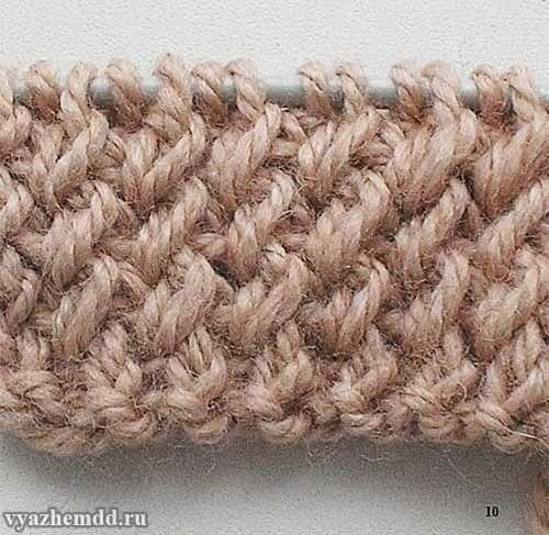узорKlubokhttp://klubok.work/1/89/7377/Klubokhttps://klubok.work/css/image/top-logo-en.pngИнтересная резинка спицами Описанная резинка хороша не только для шапочек. Она может быть и отделкой к различным трикотажным изделиям для улицы. Техника вывязывания красивой резинки. Набираем петли количеством кратным 5 (кроме кромочных). Нужно учесть, что образец содержит нечетное число «пятерок», и всё описание ориентировано на такое количество. Если у вас таких групп получается четное число, то нужно будет делать сдвиг на одну петлю. Поэтому лучше сначала провяжите образец (в примере 17 петель), чтобы понять рисунок, а потом выполняйте его на своем изделии. Первую кромочную снимаем не провязывая, последнюю вяжем изнаночной. Ход работы 1. Первый и второй ряды резинка *л, и*. 2. Пропустив лицевую, продеваем спицу в отверстие ниже изнаночной петли, вытаскиваем нить. 3. Делаем накид. 4. Две петли на левой спице вяжем лицевой. 5. Продолжаем узор с пункта 2 до пункта 4 для каждой пары петель, последняя вяжется лицевой. 6. Поворачиваем и вяжем раппорт *2 изнаночные вяжем вместе изнаночной, 1 лицевая*, 1 изнаночная. 7. Продолжаем с п.2. 8. Весь образец выглядит так: При вязании красивой резинки для головного убора саму шапочку можно вязать любым способом, здесь главное украшение – резинка. Ободок можно сделать даже шире чем в примере. Шапочку не нужно перегружать деталями, поэтому лучше, если её полотно ровное, тогда не теряется прелесть самой резинки, которая получается объемной и довольно толстой.