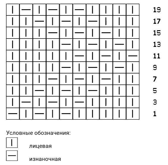 Узор спицами Зигзаг ПРОСТОЙ УЗОР. Cхема и описание от Елена Копилка узоров Вязание спицами В схеме только лицевые ряды!!! Раппорт 10 петель + 2 кромочные петли 20 рядов Поворотные ряды: 1 ряд - 5 лицевых, изнаночная, лицевая, изнаночная, лицевая, изнаночная; 2 ряд - и все четные ряды по рисунку: лицевая, изнаночная, лицевая, изнаночная, лицевая, 5 изнаночных; 3 ряд - 4 лицевые, изнаночная, лицевая, изнаночная, лицевая, изнаночная, лицевая; 4 ряд - изнаночная, лицевая, изнаночная, лицевая, изнаночная, лицевая, 4 изнаночные; 5 ряд - 3 лицевые, изнаночная, лицевая, изнаночная, лицевая, изнаночная, 2 лицевые; 6 ряд - 2 изнаночные, лицевая, изнаночная, лицевая, изнаночная, лицевая, 3 изнаночные; 7 ряд - 2 лицевые, изнаночная, лицевая, изнаночная, лицевая, изнаночная, 3 лицевые; 8 ряд - 3 изнаночные, лицевая, изнаночная, лицевая, изнаночная, лицевая, 2 изнаночные; 9 ряд - лицевая, изнаночная, лицевая, изнаночная, лицевая, изнаночная, 4 лицевые; 10 ряд - 4 изнаночные, лицевая, изнаночная, лицевая, изнаночная, лицевая, изнаночная; 11 ряд - изнаночная, лицевая, изнаночная, лицевая, изнаночная, 5 лицевых; 12 ряд - 5 изнаночных, лицевая, изнаночная, лицевая, изнаночная, лицевая; 13 ряд - лицевая, изнаночная, лицевая, изнаночная, лицевая, изнаночная, 4 лицевые; 14 ряд - 4 изнаночные, лицевая, изнаночная, лицевая, изнаночная, лицевая, изнаночная; 15 ряд - 2 лицевые, изнаночная, лицевая, изнаночная, лицевая, изнаночная, 3 лицевые; 16 ряд - 3 изнаночные, лицевая, изнаночная, лицевая, изнаночная, лицевая, 2 изнаночные; 17 ряд - 3 лицевые, изнаночная, лицевая, изнаночная, лицевая, изнаночная, 2 лицевые; 18 ряд - 2 изнаночные, лицевая, изнаночная, лицевая, изнаночная, лицевая, 3 изнаночные; 19 ряд - 4 лицевые, изнаночная, лицевая, изнаночная, лицевая, изнаночная, лицевая; 20 ряд - изнаночная, лицевая, изнаночная, лицевая, изнаночная, лицевая, 4 изнаночные; 21 ряд - повторять с 1-го ряда. Круговые ряды: Раппорт 10 петель + 2 кромочные петли 20 рядов 1 ряд - 5 лицевых, изнаночная, лицевая, изнаночная, лицевая, изнаночная; 2 ряд - и все четные ряды по рисунку: 5 лицевых, изнаночная, лицевая, изнаночная, лицевая, изнаночная; 3 ряд - 4 лицевые, изнаночная, лицевая, изнаночная, лицевая, изнаночная, лицевая; 4 ряд - 4 лицевые, изнаночная, лицевая, изнаночная, лицевая, изнаночная, лицевая; 5 ряд - 3 лицевые, изнаночная, лицевая, изнаночная, лицевая, изнаночная, 2 лицевые; 6 ряд - 3 лицевые, изнаночная, лицевая, изнаночная, лицевая, изнаночная, 2 лицевые; 7 ряд - 2 лицевые, изнаночная, лицевая, изнаночная, лицевая, изнаночная, 3 лицевые; 8 ряд - 2 лицевые, изнаночная, лицевая, изнаночная, лицевая, изнаночная, 3 лицевые; 9 ряд - лицевая, изнаночная, лицевая, изнаночная, лицевая, изнаночная, 4 лицевые; 10 ряд - лицевая, изнаночная, лицевая, изнаночная, лицевая, изнаночная, 4 лицевые; 11 ряд - изнаночная, лицевая, изнаночная, лицевая, изнаночная, 5 лицевых; 12 ряд - изнаночная, лицевая, изнаночная, лицевая, изнаночная, 5 лицевых; 13 ряд - лицевая, изнаночная, лицевая, изнаночная, лицевая, изнаночная, 4 лицевые; 14 ряд - лицевая, изнаночная, лицевая, изнаночная, лицевая, изнаночная, 4 лицевые; 15 ряд - 2 лицевые, изнаночная, лицевая, изнаночная, лицевая, изнаночная, 3 лицевые; 16 ряд - 2 лицевые, изнаночная, лицевая, изнаночная, лицевая, изнаночная, 3 лицевые; 17 ряд - 3 лицевые, изнаночная, лицевая, изнаночная, лицевая, изнаночная, 2 лицевые; 18 ряд - 3 лицевые, изнаночная, лицевая, изнаночная, лицевая, изнаночная, 2 лицевые; 1