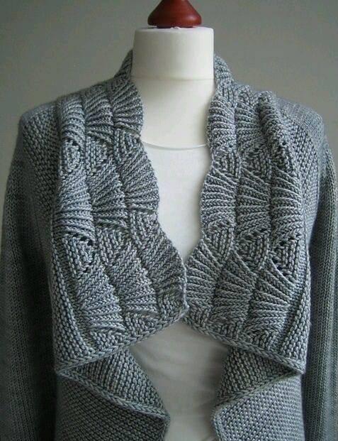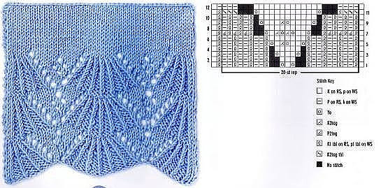 Описание узора 1-й ряд: 1 изнаночная, 1 накид, (1 лицевая, 2 изнаночных)*8раз, 1 лицевая, 1 накид, 1 изнаночная. 2-й ряд:1 лицевая, 1 изнаночная, 1 накид, (1 изнаночная, 2 лицевых)*8раз, 1 изнаночная, 1 накид, 1 изнаночная, 1 лицевая. 3-й ряд: 1 изнаночная, 2 лицевых, 1 накид, (1 лицевая, 2 изнаночных)*8раз, 1 лицевая, 1 накид, 2 лицевых, 1 изнаночная. 4-й ряд: 1 лицевая, 3 изнаночных, 1 накид, (1 изнаночная, 2 лицевых)*8раз, 1 изнаночная, 1 накид, 3 изнаночных, 1 лицевая. 5-й ряд:1 изнаночная, 4 лицевых, 1 накид, (1 лицевая, 2 изнаночных)*8раз, 1 лицевая, 1 накид, 4 лицевых, 1 изнаночная. 6-й ряд: 1 лицевая, 5 изнаночных, 1 накид, (1 изнаночная, 2 лицевых)*8раз, 1 изнаночная, 1 накид, 5 изнаночных, 1 лицевая. 7-й ряд: 1 изнаночная, 6 лицевых, 1 накид, (1 лицевая, 2 изнаночных)*8раз, 1 лицевая, 1 накид, 6 лицевых, 1 изнаночная. 8-й ряд: 1 лицевая, 7 изнаночных, 1 накид, (1 изнаночная, 2 вместе лицевой)*8раз, 1 изнаночная, 1 накид, 7 изнаночных, 1 лицевая. 9-й ряд: 1 изнаночная, 8 лицевых, (2 вместе лицевой с наклоном влево)*4раза, 1 лицевая, (2 вместе лицевой с наклоном вправо)*4раза, 8 лицевых, 1 изнаночная. 10-й ряд: по рисунку. 11-й ряд: повторить с первого ряда.