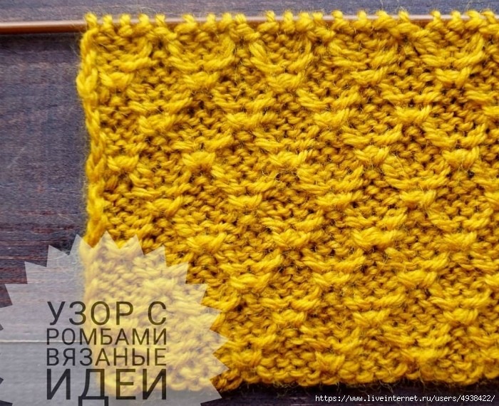 Эффектный рельефный узор c ромбамиKlubokhttp://klubok.work/1/89/8039/Klubokhttps://klubok.work/css/image/top-logo-en.pngЭффектный рельефный узор c ромбами Узор получается с изнаночной стороны. Количество петель должно делиться на 4 плюс 3 петли для симметрии и 2 кромочные. Схема вязания: 1 ряд: кром, ???? изн, снять петлю с накидом, 3 изн, кром. 2 ряд: кром, ???? лиц, ???? накид и снять петлю с накидом, 3 лиц, кром 3 ряд: кром. 3 изн, 1 накид и снять петлю с 2 накидами,*, кром 4 ряд: кром, лицевые(петлю с 3 накидами провязать, как одну), кром 5 ряд: кром, 1 изн, снять петлю с накидом, ???? изн. до посл. 3 п., снять петлю с накидом, изн, кром. 6 ряд: кром, 1 лиц, ???? накид, снять петлю с ???? накидами, ???? лиц, до посл.3 пет, 1 накид, снять петлю с 2 накидами, 1 лиц, кром. 7 ряд: кром, 1 изн, ???? накид, снять петлю с ???? накидами, ???? изн. до посл. 3 п., 1 накид, снять петлю с 3 накидами, изн, кром. 8 ряд: кром, лицевые(петлю с 3 накидами провязать, как одну), кром Узор повторяется с 1 ряда.