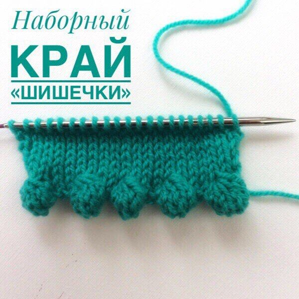 Наборный край с шишечкамиKlubokhttp://klubok.work/1/89/8221/Klubokhttps://klubok.work/css/image/top-logo-en.pngПровяжите 1 р. изнаночными. Поверните вязание. Провяжите кромочную петлю, затем 1 лицевую п. Затем необходимо начать выполнять «шишечки». Для этого свяжите в следующую петлю [1 лиц., 1 накид, 1 лиц., 1 накид, 1 лиц.], таким образом на правой спице теперь 7 петель. На пяти из них – на тех, которые вывязаны из одной п. предыдущего ряда – будет выполняться «шишечка». Поверните вязание свяжите *1 изн., 1 изн. за заднюю стенку*, повторите от * до * еще раз, свяжите 1 изн. 5 петель «шишечки» израсходованы. Поверите вязание и провяжите эти же 5 п. лицевыми. Вновь поверните вязание, и провяжите эти 5 п. изнаночными. Поверните вязание еще раз и снова провяжите петли лицевыми. Теперь пропустите вторую петлю на правой спице через первую, а затем повторите этот прием, пока на спицах не останется одна петля вместо пяти, а на правой спице таким образом останется всего 3 п. Провяжите лицевыми петли, отделяющие одну «шишечку» от другой (в нашем случае это 3 п.) Повторяйте шаги 4-10 до тех пор, пока на левой спице не останется 3п. Последнюю «шишечку» выполните, как и предыдущие, но после нее провяжите 1 лиц. и 1 кром. Поверните вязание, провяжите ряд изнаночными.