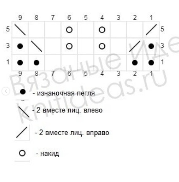 .На схеме показаны только лицевые ряды. Четные ряды вязать по рисунку, то есть как смотрят петли: лицевые вязать лицевыми, изнаночные - изнаночными. Накиды провязывать изнаночными. Эта схема также подойдет и для вязания по кругу.