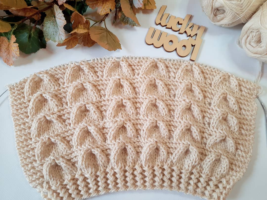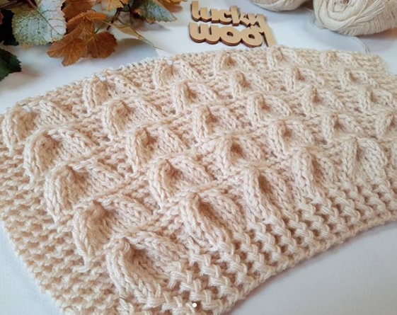 7 ряд: кром, *4 лиц, 4 петли вместе лицевой за заднюю стенку, 4 петли вместе лицевой за переднюю стенку, 3 лиц*, лиц, кром.