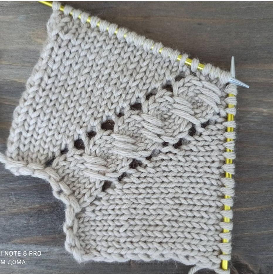4 ряд: накид привязать изнаночной петлей так, чтобы образовалась дырочка , 6 изнаночных петель привязать с двумя накидами (смотри видео) , провязать накид изнаночной петлей.