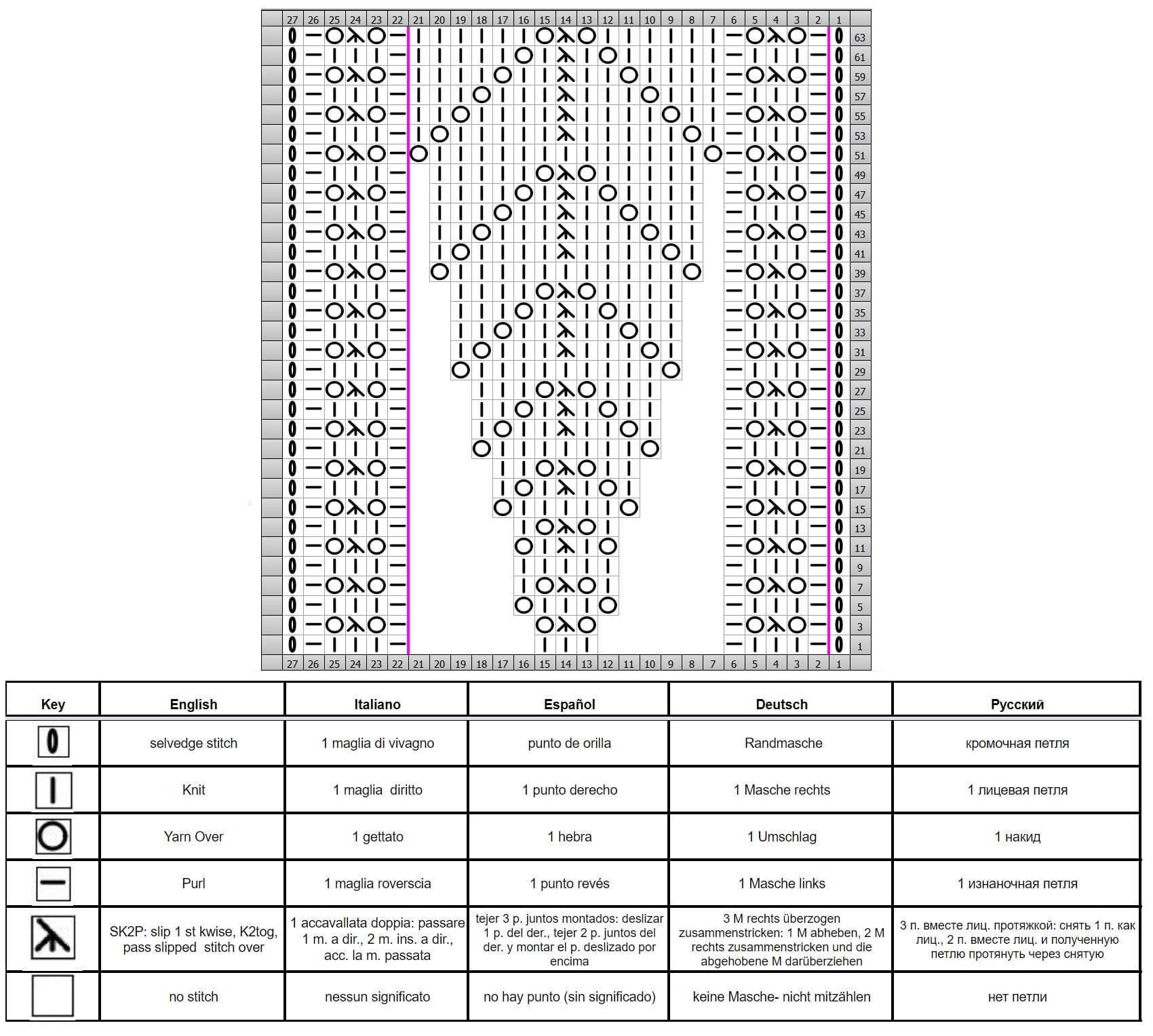Набрать 15 п. и вязать согласно схеме, на которой приведены только лиц. ряды.