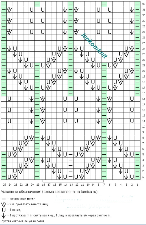 ∨ : 1 протяжка (снять 1 п. как лицевую, 1 лиц., протянуть снятую петлю через провязанную)