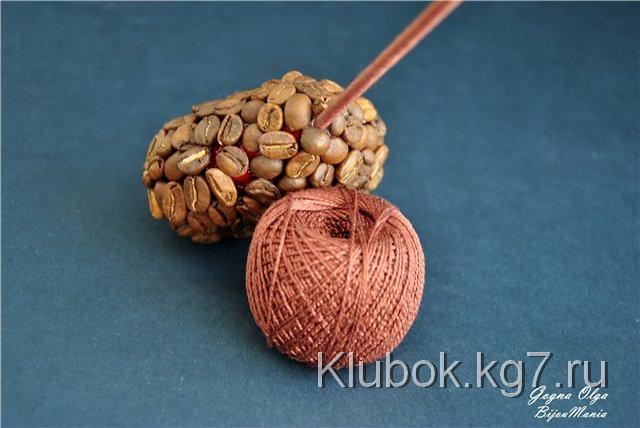 - При помощи клея-пистолета обклеиваем сердечко зернами кофе. Так как этот клей быстро сохнет, наносим его на небольшие участки - приклеиваем зерна, снова наносим и снова приклеиваем