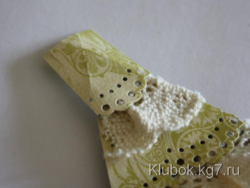 Из бумаги для скрапбукинга вырезаем отрезки шириной в полтора раза больше ширины кружева, один из длинных краев которых делаем кружевными при помощи дырокола либо фигурных ножниц.