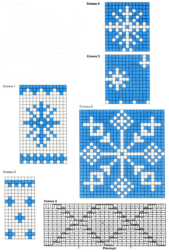 Спинка: наберите 86 п. белой нитью в два сложения, провяжите лиц. гладью 4 ряда Затем выполните ажурный ряд и провяжите еще 5 рядов лиц. гладью. Следующий ряд провяжите следующим образом: *3 лиц. п., 1 накид, 1 двойная протяжка (= снимите 2 п. не провязывая, провяжите 1 п. и протяните ее через обе снятые петли), 1 накид*, повторяйте *-*, в конце ряда вяжите 2 лиц. п. Далее вяжите жаккардовым узором 1, распределяя раппорты симметрично. После выполнения схемы вяжите голубой нитью лиц. гладью 18 см. Далее вяжите узором с ромбами, распределяя его симметрично.