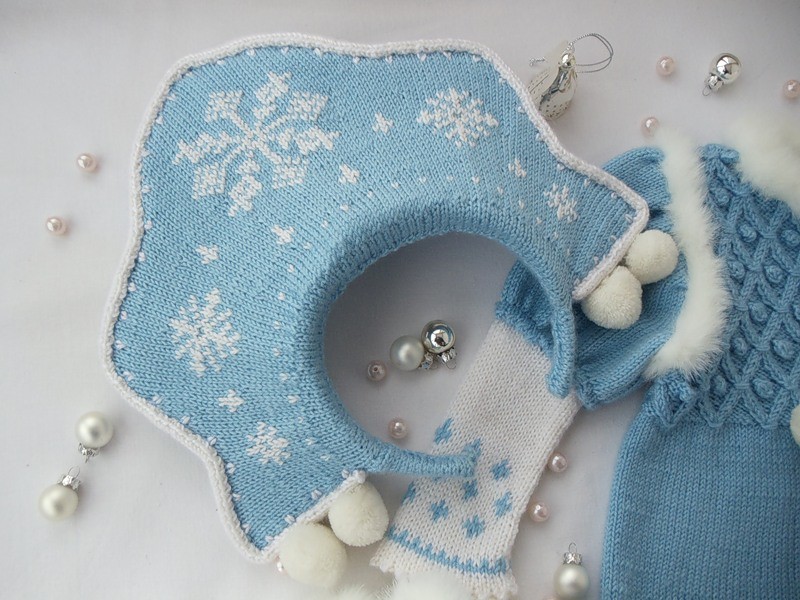 Вам потребуется: пряжа Super Merino (50% шерсть, 50% акрил, 280 м/100 г) - 250 г голубого цвета, Brilliant (49% шерсть, 51% акрил, 380 м/100 г) - 50 г белого цвета, спицы № 3, 6 маленьких белых помпонов, немного белого искусственного меха, пластиковый ободок или готовый кокошник.