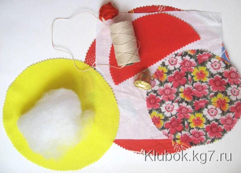 тонкой. Немного синтепона для головы. Колокольчик, нитки для обвязок. Косынку