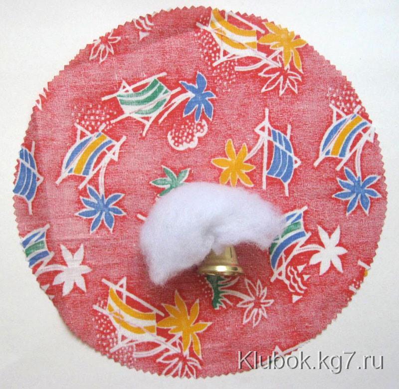 2 К колокольчику привязываем нитку и привязываем его к синтепону. Синтепон