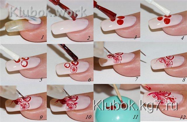 Тут показаны точки которые нужно поставить лаком, а стрелочками - это движение зубочисткой (иголкой)