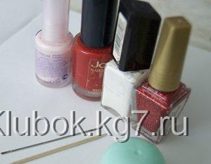 лака с блестками. Берем зубочистку и начинаем с помощью точек и мазков