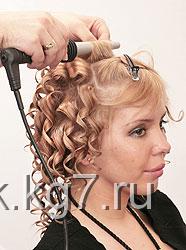 Чистые сухие волосы делим в горизонтальном направлении ступеньками снизу вверх. Верхнюю часть закалываем зажимом. Разделяем пряди и накручиваем их на плойку по всей голове, чтобы получились красивые локоны. |