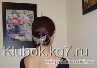 Используется нарядная заколка-автоматик в виде бабочки, что придаёт причёске оригинальности.