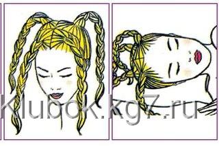(поперечным пробором). Каждую пригладь щеткой, концы зафиксируй резинками. Уложи