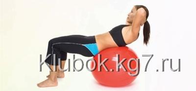 Исходное положение: лежа спиной на мяче таким образом, чтобы он оказался под поясницей. Руки лежат на затылке, ноги расставлены на ширине плеч.Поднимите корпус, стараясь оторвать его от мяча. При этом должны активно работать верхние мышцы живота. Повторите 15 раз. Упражнение также можно выполнять, лежа на полу, тогда нужно стремиться к максимальному отрыву лопаток от пола.