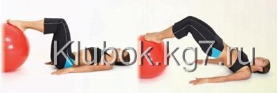 Исходное положение: лежа на спине, руки вытянуты вдоль тела, согнутые под прямым углом ноги упираются стопами в мяч. Оторвите ягодицы и корпус от пола, упираясь в поверхность пола лопатками и руками. В верхнем положении сожмите ягодицы. Выполните упражнение 15 раз. Если упражнение выполняется с легкостью, усложните его: поднимайте корпус, положив стопу одной ноги на колено другой.Можно делать это упражнение и без мяча: тогда стопы должны упираться в поверхность пола. Всё остальное исполняется аналогично варианту с фитболом.