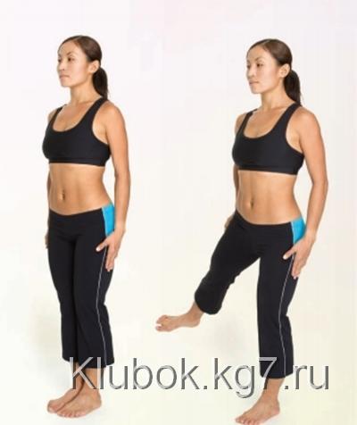Исходное положение: стоя, прямые ноги вместе, ладони лежат на бедрах.Выполните правой ногой махи в сторону, держа ногу прямой и оттянув носок на себя. Сделайте 15–20 махов, после чего повторите упражнение левой ногой.