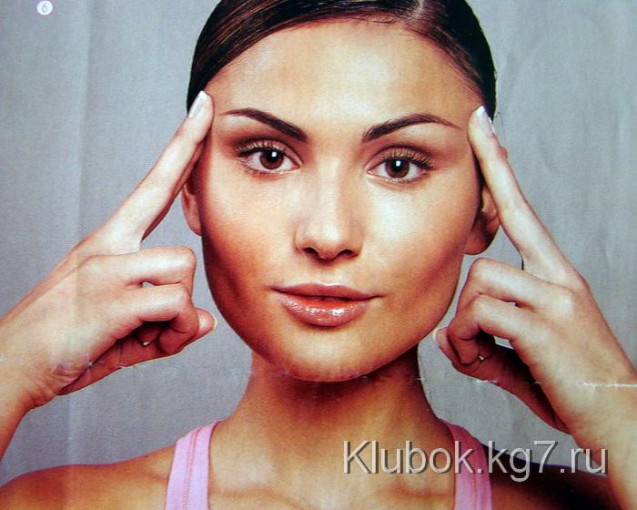 Оба средних пальца установите над бровями. Большие пальцы - на висках. Локти разверните, плечи расслабьте. Подушечками пальцев на лбу начинаем пульсацию в направлении от носа. Вы сразу заметите эффект: морщины, пролегающие от крыльев носа к уголкам губ, разглаживаются. Сделайте 60 пульсаций. Если устали руки, потрясите кистями. Затем снова принимайтесь за дело!