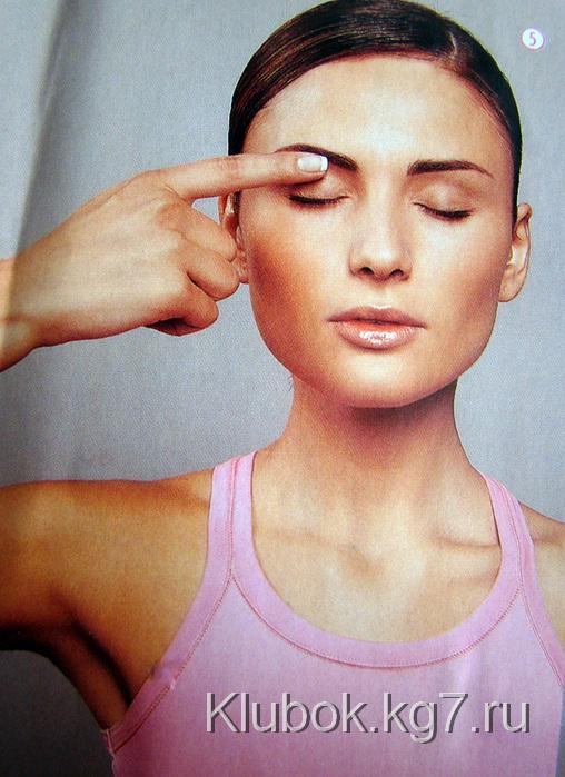 Средний палец поставьте над кончиком брови, указательный - за средним. Широко откройте глаза. Внешние уголки глаз тяните наверх в сторону висков. Внутренние уголки глаз - к основанию носа. Почувствуйте, как мышцы приходят в движение. Теперь очень-очень осторрожно начинайте пульсировать кончиками пальцев вверх. Произведите более 60 пульсаций.