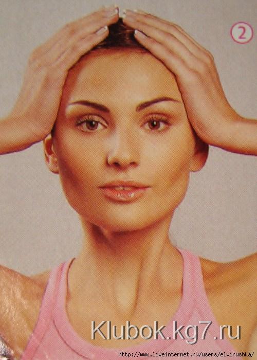 Пройдитесь одной рукой от лба к затылку, другой - от шеи к затылку. Обе руки двгаются с одинаковой скоростью. Запомните, где встретились руки, и массируйте кожу головы, проводя пальцами от лба, затылка и ушей к найденной точке. Потом мните, чешите, щекочите кожу в этих направлениях, как вам нравится. представляйте при этом, что у вас на голове тугой шлем из мышц. Повторяйте упражнение от двух минут ...до бесконечности.
