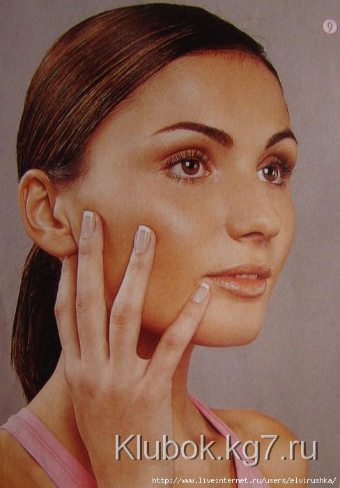 Подушечки пальцев разместите на точках, которые будут указаны в выбранном вами упражнении. Прикасайтесь к этим точкам очень нежно! Теперь начинайте легко надавливать - в направлении назад т вверх. при этом ткань лица смещается не более чем на 1-2 мм. С помощью этого упражнения можно, как выражается Б. Кантиени, "разбудить" важнейшие мышцы лица.