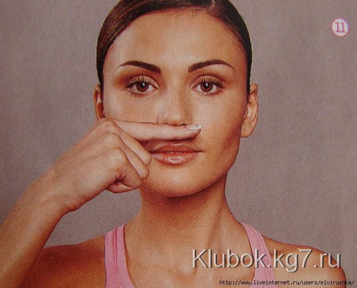 Поднимите правый локоть, рука перпендикулярна телу. Указательный палец поставьте горизонтально под носом. Теперь проведите пальцами левой руки от кончика носа по его основанию и лбу к зоне начала росто волос надо лбом. Повторите 5 раз. Теперь, напрягая мышцы лица, опускайте его по направлению к губам, "нажимайте" им на палец. Не поднимайте верхнюю губу. Если у вас маленький носик - 20 раз. Широкий - 100 раз.