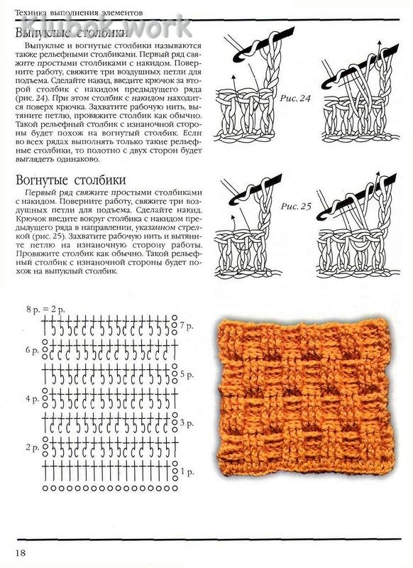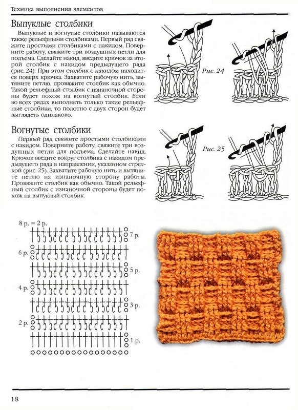 На изображении показано, как вязать выпуклые и вогнутые рельефные столбики с накидом в крючковом вязании.