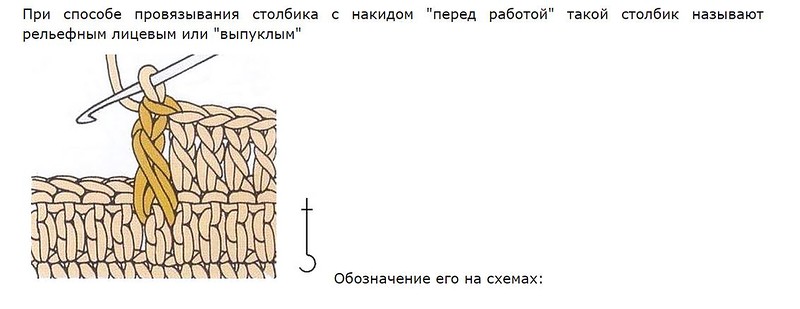 "При способе провязывания столбика с накидом перед работой такой столбик называют рельефным лицевым или выпуклым"