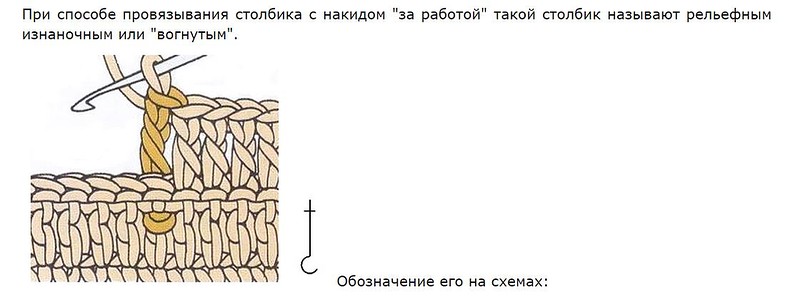 "При способе провязывания столбика с накидом за работой такой столбик называют рельефным изнаночным или вогнутым"