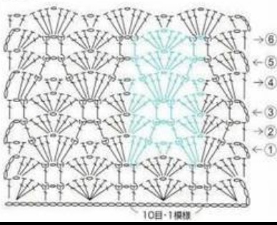 3 воздушные петли подъема, 2 рельефных столбика с 1-им накидом перед работой, * 3 рельефных столбика с 1-им накидом за работой, 3 рельефных столбика с 1-им накидом перед работой *, 3 рельефных столбика с 1-им накидом за работой, 2 рельефных столбика с 1-им накидом перед работой, полустолбик с накидом в воздушную петлю предыдущего ряда;